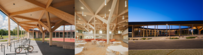 Õppehoone sissepääsu esine liimpuidust varikatus ühendab hoone avaliku ruumiga. Hoonele annavad arhitektuurse iseloomu külgpainutatud talad, harulised liimpuidust tugisambad, liimpuitpostid ning lõpuni viimistletud sõlmlahendused.
